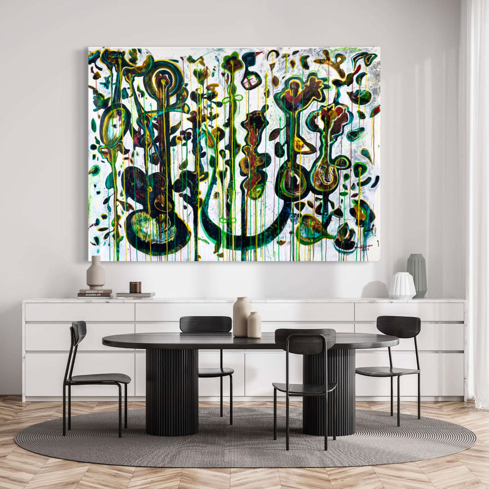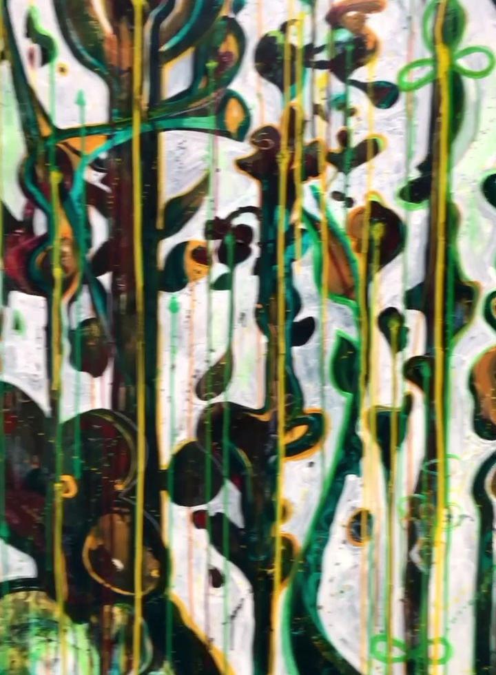 Layers of paint are painted, poured, run, and built up intuitively, each stroke shaping the next in a fluid, organic dance. Colours shift and merge, forming biomorphic shapes that echo nature’s quiet transformations. A final white layer is then used to paint away sections, obscuring some forms while revealing others—like light filtering through dense undergrowth. This process of reveal and unrevealed creates depth, pushing certain shapes into the background while pulling others forward, a play on presence and absence, seen and unseen. The painting becomes a living entity, evolving through its layers, much like nature itself.