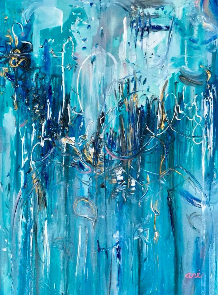 I Love You is a deeply intuitive piece, created through gestural mark-making and layered acrylics and inks. As I painted, the word "love" echoed in my mind, guiding each stroke. The expressive use of palette knives, along with fluid paint runs, builds the textured surface of the canvas. A rich, vibrant colour palette of turquoise, dark blue, soft ballet pink, and shimmering gold evokes the complexity of love — its depth, warmth, and softness.