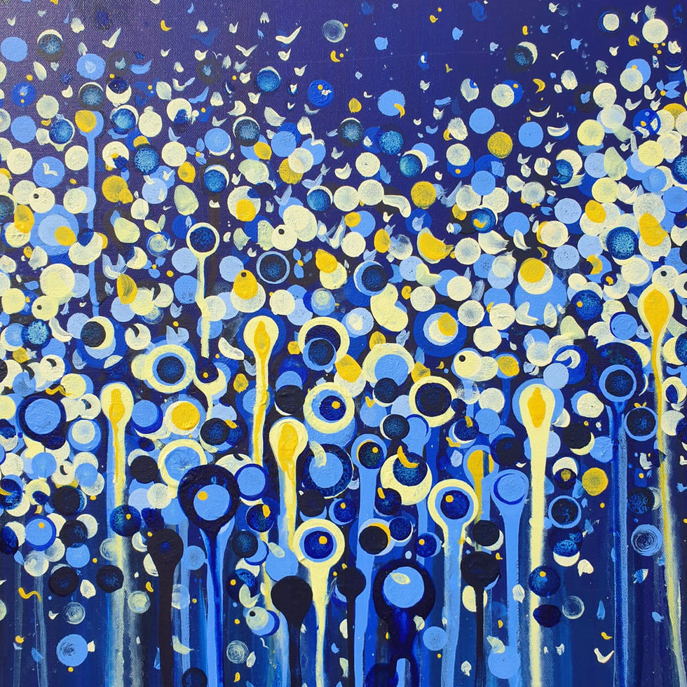 Lit Up the Midnight Sky captures the fleeting beauty of nature in full bloom beneath a moody, moonlit sky. This abstract painting evokes the energy of flowers bursting open in the night, their delicate forms illuminated against deep midnight blue. Fluid paint runs and expressive mark-making create movement and depth, suggesting petals caught in a breeze or the quiet glow of blossoms under soft lunar light. Layers of acrylics and inks blend intuitively, allowing colour and texture to emerge organically, mirroring the spontaneity of nature itself.